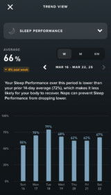 As seen in the graph above, I do not get enough sleep. Aside from the obvious outlier, addressing this issue would require significant changes in my life. First, I would likely need to become a full-time athlete without any other obligations. Secondly, I’m not even sure if I could train my body to sleep for 10 consecutive hours. Therefore, having Whoop repeatedly remind me of my sleep debt doesn’t help; I need more personalized coaching with manageable steps. Since this level of achievement seemed unrealistic for me, I eventually stopped trying to improve my sleep.
