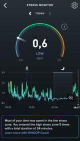 - Stress: This measures how alert and activated you are, which is inferred from the current heart rate (HR) and heart rate variability (HRV). Stress can be good when needed, like being alert and „On“ during an activity. Stress is bad when it is still there when you should be relaxed, especially during sleep. It is one of the significant challenges for most amateurs, as we are much more stressed beyond our training, which impacts our ability to recover. Whoop has a score from 1 to 3, where lower is less stress, and Garmin uses a score from 0 to 100, where above 50 is more stressed.